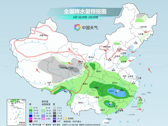 预计4月2日至4日,西南地区东部、江汉、江淮南部、江南、华南及西藏东南部等地的部分地区有大雨或暴雨,其中江南、华南北部局部有大暴雨,部分地区伴有短时强降水、雷暴大风或冰雹等强对流天气。