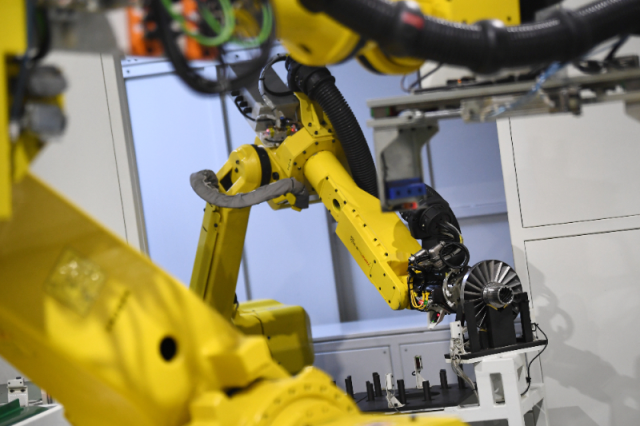 1月20日,在位于咸阳市秦都区装备制造产业园的法士特智能制动公司,缓速器机加车间转子下料单元的机械臂在生产线上工作。新华社记者 李一博 摄