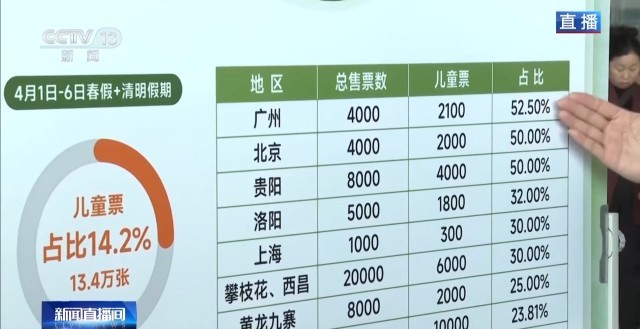4月1日从成都始发的列车,到广州和北京的列车分别有4000个座席的铁路车票,儿童票的占比分别达到了52.5%和50%,铁路出行也成了很多家长春假出行共同的选择。