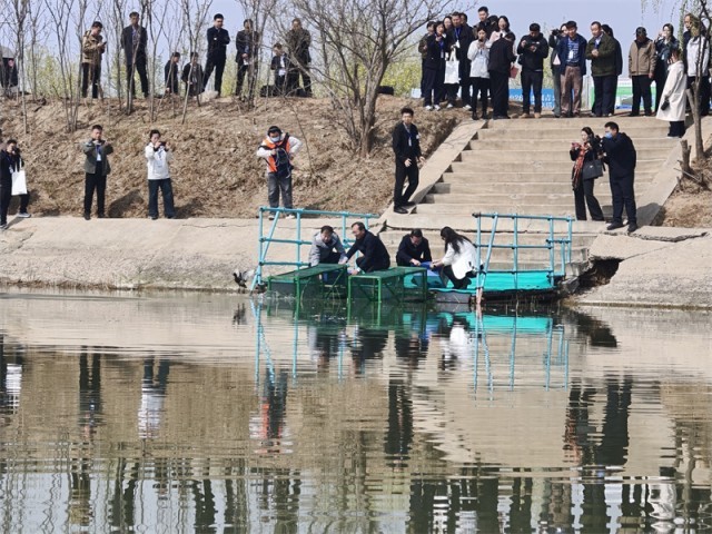 4月2日上午,全球首次青头潜鸭野化放飞活动在衡水湖举行。图为放飞现场。河北日报记者 焦磊 摄