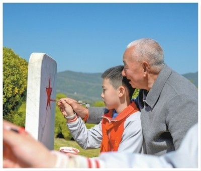 “每年清明前我们一家就会过来,把墓碑认认真真擦亮,给烈士们添上一捧新土。”王建刚弯腰擦碑,王菡也学着爷爷的样子用软布轻擦碑身。