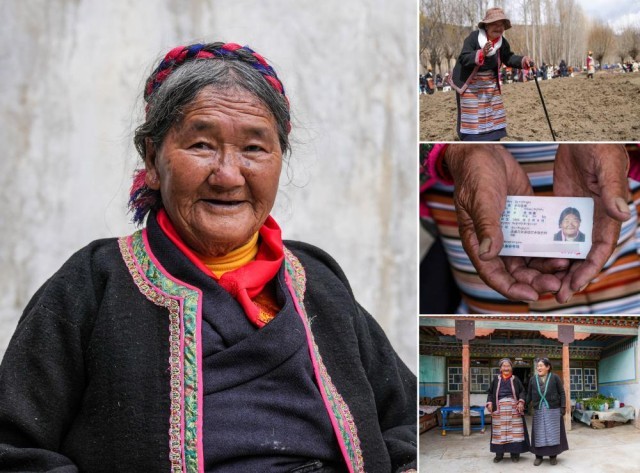 拼版照片:(左)卓玛吾珠的肖像(3月16日摄);(右上)卓玛吾珠在庆祝春耕仪式上(3月16日摄);(右中)卓玛吾珠的身份证(3月16日摄);(右下)卓玛吾珠(左)和女儿在家中的合影(3月16日摄)。