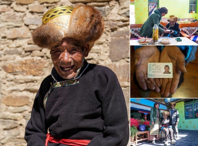 拼版照片:(左)次仁桑珠的肖像(3月25日摄);(右上)次仁桑珠在西藏山南市扎囊县桑耶镇的家中亲吻曾孙(3月25日摄);(右中)次仁桑珠的身份证(3月25日摄);(右下)次仁桑珠(中)和孙女、曾孙在西藏山南市扎囊县桑耶镇家中的合影(3月25日摄)。