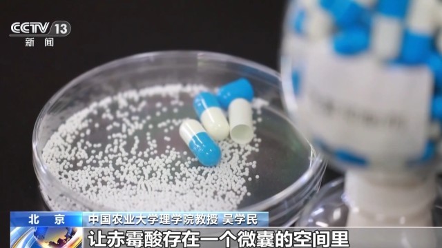 中国农业大学理学院教授 吴学民:赤霉酸是一个内源激素,特别容易分解,最快在7天之内就会分解掉,我们现在主要实验工作,通过缓释化技术,主要是做成这种微囊,让赤霉酸存在一个微囊的空间里。让它能够比较长时间存在,另外让它逐步释放。