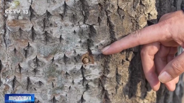 中国农业大学理学院博士研究生 王寅敏:没有打药的树上有非常多的雌株花序,这个花序经过开花之后,就会产生白色的飞絮,也就是我们常见的毛毛。采用新型抑制剂注药处理过的树完全没有花序产生。