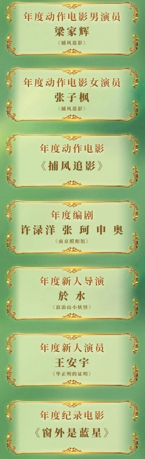 动作电影《捕风追影》荣获年度动作电影、年度动作电影男演员、年度动作电影女演员三项荣誉。《唐探1900》荣获年度喜剧电影。《长安的荔枝》主演大鹏在领取年度喜剧电影男演员荣誉时感言:“第一次有一个荣誉鼓励喜剧创作,从来没有这么被重视过。”