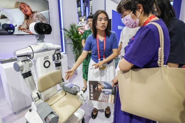 ↑ 4月14日,参观者在第六届消博会现场观看AI陪伴机器人。新华社记者 郭程 摄