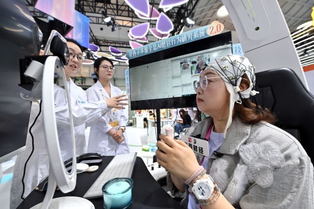 ↑ 4月14日,观众在第六届消博会孚宝智能展台体验AI心理筛查机器人。新华社记者 蒲晓旭 摄