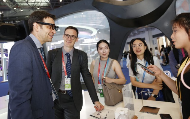 ↑ 4月14日,在第六届消博会科技消费展区,观众在科大讯飞展台咨询AI眼镜。新华社记者 高静 摄