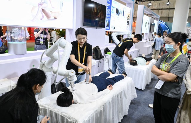 ↑ 4月14日,观众在第六届消博会现场体验智能按摩机器人。新华社记者 杨冠宇 摄
