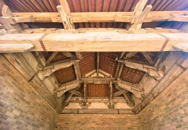 舞楼最独特的是戏台顶部的八卦藻井,没有一根大梁椽木,天井勾栏交榫不用一铆一钉,其细木交连,层层向上,构成穹顶。屋顶鸱吻为元代构件,琉璃瓦品为孔雀蓝色,十分珍贵。