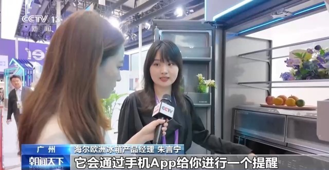海尔欧洲冰箱产品经理 朱言宁:在冰箱的顶部有一个AI Vision的摄像头,屏幕上就会识别出来我们放入的是柠檬,如果到了临期的时候,它会通过手机App给你进行一个提醒。
