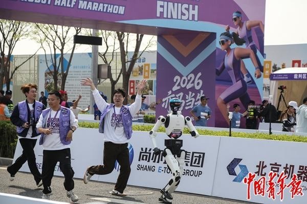 4月19日,北京经济技术开发区,2026北京亦庄半程马拉松暨人形机器人半程马拉松比赛现场,一名人形机器人选手冲过终点线,队员们欢呼庆祝。在当日进行的人形机器人半程马拉松中,获得前三名的人形机器人选手成绩均打破人类半马世界纪录。据了解,本届人形机器人半马吸引了来自全国11个省份超过100支队伍参赛,覆盖企业、高校等多种类型,还包括5支海外团队。参赛机器人数量激增至300多台,规模是去年的5倍。中青报·中青网记者 赵迪/摄