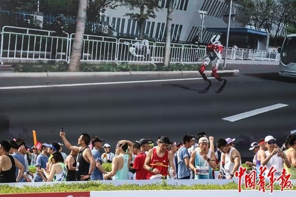 4月19日,北京经济技术开发区,2026北京亦庄半程马拉松暨人形机器人半程马拉松比赛现场,一名聚精会神关注比赛的年轻人。中青报·中青网记者 赵迪/摄