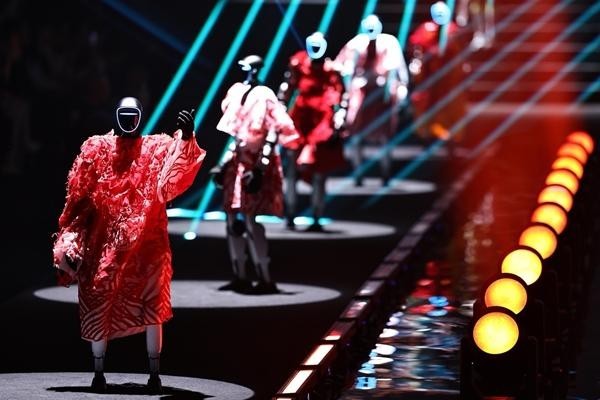 3月18日,广东汕头,第五届潮汕国际纺织服装博览会开幕大秀上,人形机器人“模特”在走秀。展会首次设立AI及创新服务展区,集中展示AI设计、智能制造等前沿成果。刘占崑/摄