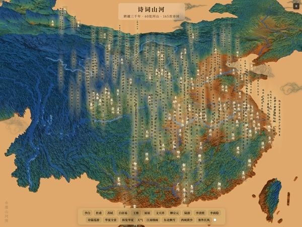 最近,他花了近两个月,做了一个名为“诗词山河”的作品,将165首古代诗词,用地理坐标的形式展现在中国地图上。