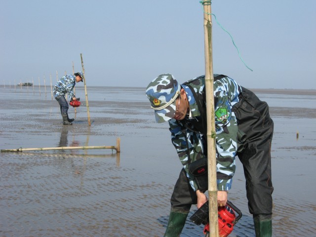 钮栋梁在保护区工作已经有22年,亲眼见证并亲历了东滩保护区的巨大变化。崇明东滩保护区位于崇明岛的最东端,是东亚-澳大利西亚候鸟迁飞路线上重要的停歇地和越冬地。他回忆起初入保护区时的情景,为了尽快熟悉地形地貌和鸟类栖息规律,他和同事一起在坑坑洼洼的土路上骑着自行车巡护,扛着单筒望远镜,穿着下水裤深入滩涂,手拉手蹚过潮沟,观察并记录鸟类、植被等情况。