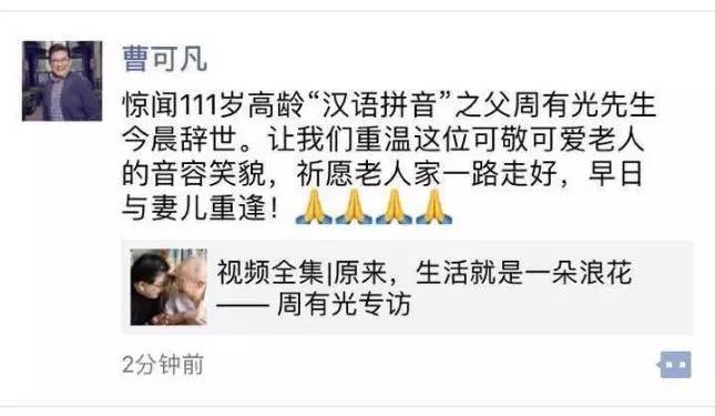 中国著名语言学家、文字学家、经济学家,被誉为“汉语拼音之父”的周有光先生,于2017年1月14日去世,享年112岁!今天上午,曹可凡通过自己的微博透露了这一消息……