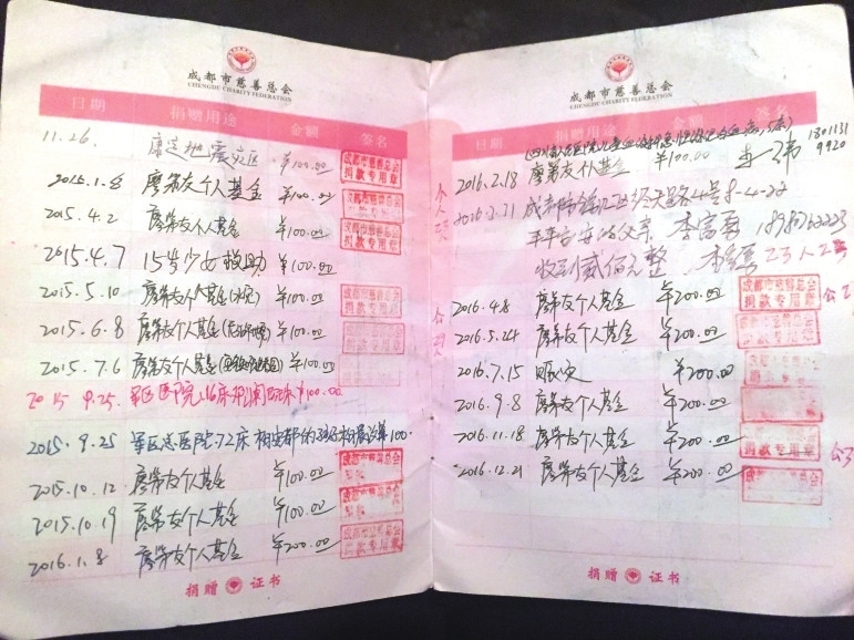 从赈灾捐款,到为爱助医,从公众熟知的“提灯女孩”王思培,到无人注意的早产双胞胎,成都慈善总会为廖弟友发放的捐款证书上,每一页都记着受助者的名字和个人基金的用途。翻看捐款证书,仅从2011年3月到2016年12月这段时间内,廖弟友的捐款次数达到58次,最近一次是2016年12月存入个人慈善基金的记录。