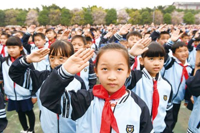 2月20日,孩子们在南宁市滨湖路小学面向国旗敬礼。 (新华社记者 周华/摄)