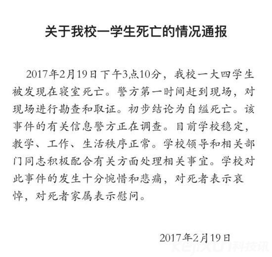 2月21日消息,学生寝室自缢身亡 请理性看待压力。2017年2月19日下午3点10分,一大四学生在寝室死亡。警方第一时间赶到勘查取证,初步结论为自缢死亡,该事件有关信息警方正在调查中。无论是因为什么原因,都希望其家属能节哀,愿逝者安息。