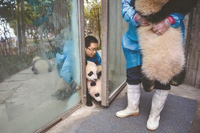 大熊猫保姆们随时要保持高度警惕,只要有一点缝隙,调皮的大熊猫宝宝就想趁机溜出去。