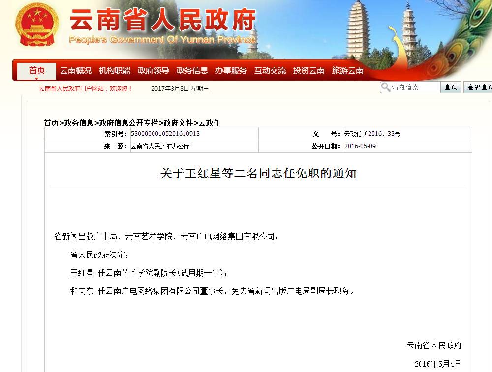 从云南省人民政府网站上,关于王红星任职的任免通知中可以看到,2016年5月4日省人民政府任命王红星为云南艺术学院副院长,试用期一年。而到昨天省纪委发布消息止,他任职仅十个月,试用期尚未满。