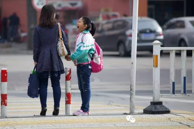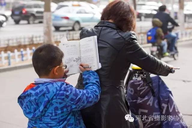 5. 早晨,一位看上去只有一二年级的小学生趴在妈妈后背上看书学习。