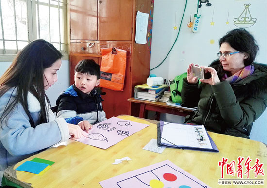 杜雪慧(右)在湘西土家族苗族自治州残疾人联合会康复中心记录听障儿童刘浩明的上课情况。蒋欣/摄