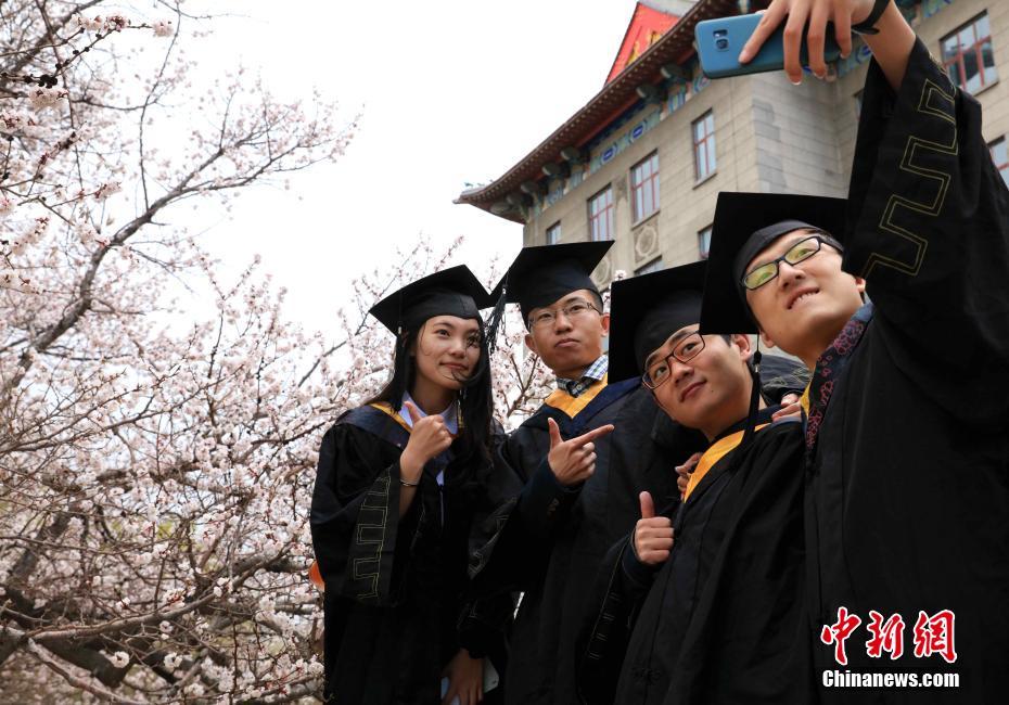4月25日,中国北疆省会哈尔滨一场春雨过后,众多学生和拍友在哈尔滨工程大学校园内成片的杏花树下拍照留影。近日,哈尔滨城区杏花竞相开放,为北疆“迟来”的春天增添了绚丽色彩,吸引民众赏花,感受北国“杏花烟雨”。中新社记者 王舒 摄