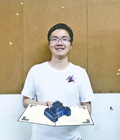 他们最大的创新点是把学校优秀历史建筑——老图做成立体卡片,夹在册子里。他们先采集建筑空间数据,建三维模型,再利用垂直切片结构将建筑重新构建,然后激光打印各切片,再重新拼装为立体建筑,打开纪念册“老图”立体呈现,把书合起则是平面。下一步他们还会设计校内其他历史建筑。