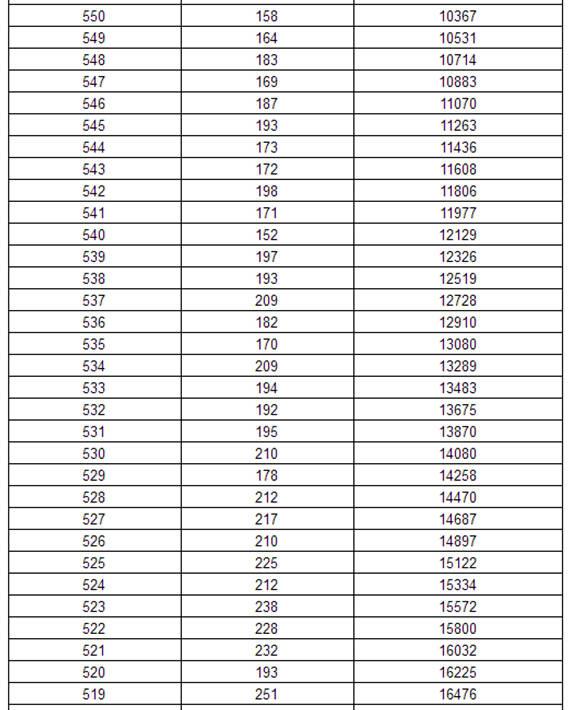 2017年黑龙江省普通高考理科类分数段统计表详细如下: