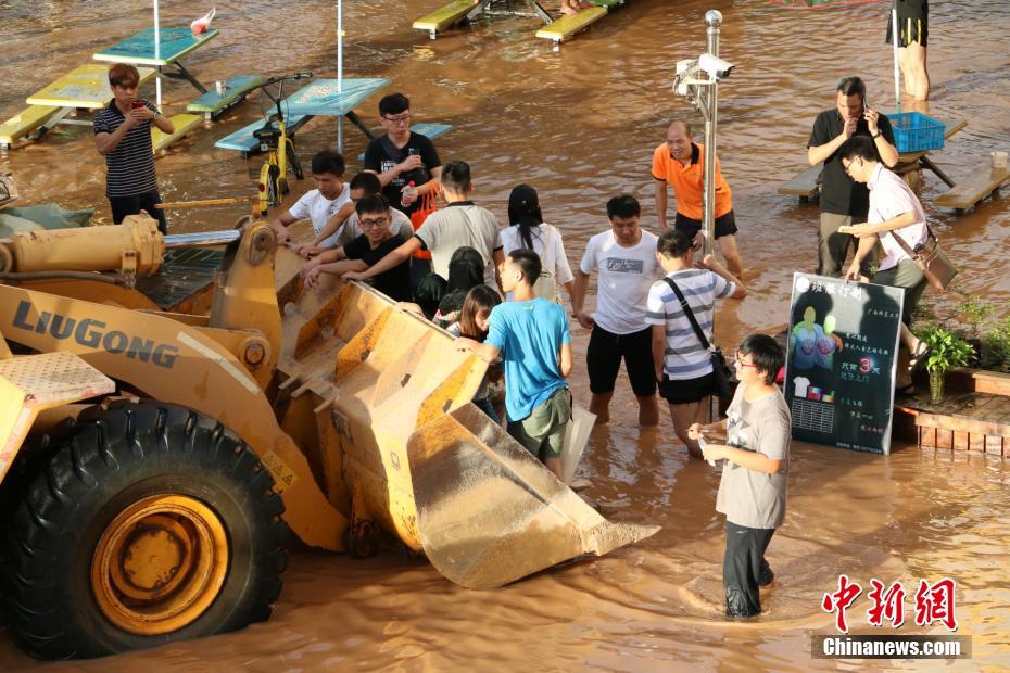 7月2日,位于桂林市的广西师范大学雁山校区部分路段因河水倒灌,校内部分路段受到水淹,汛情紧急。学校已经启动了应急预案,目前,各项紧急抢险措施正在展开。学校安排了铲车救援受困学生,安排铲车为受困学生免费送盒饭。中新社记者 王董 摄