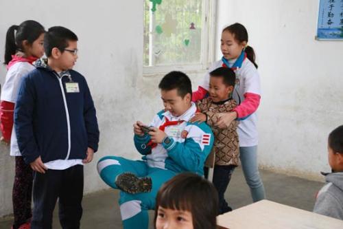 广东省广州市的小学生到广东清远的山村小学支教,为山村留守儿童上网络安全课。图为“小讲师”们演出情景剧模拟孩子们玩游戏时的不良姿势,让学生们纠正。赵晖/摄