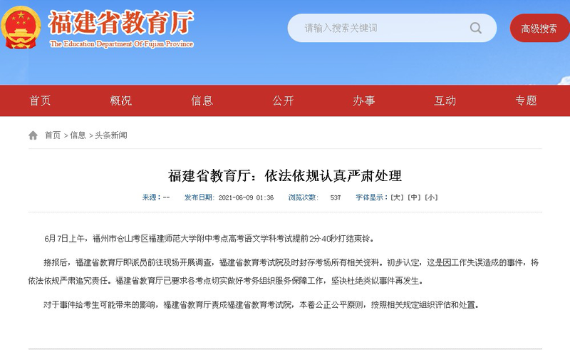 中国青年报客户端福州6月9日电( 中青报·中青网记者陈强)6月7日上午,福州市仓山考区福建师范大学附中考点高考语文学科考试提前2分40秒打结束铃。针对这一事件,福建省教育厅今天凌晨在官网发布信息称,初步认定系工作失误所致。