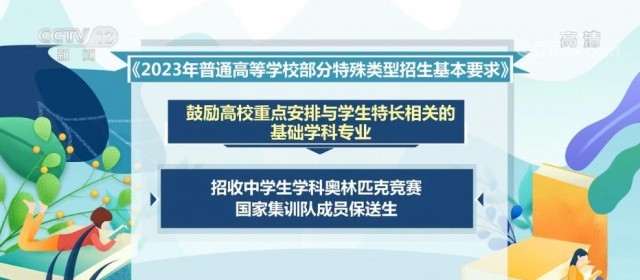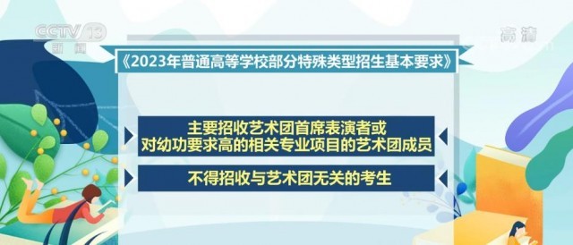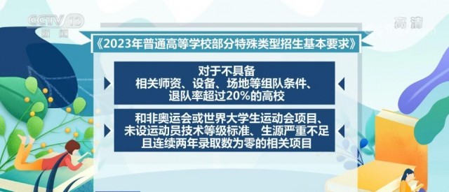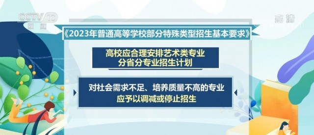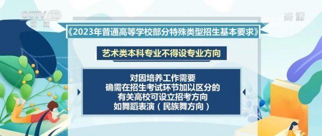 央视网消息:教育部下发的《2023年普通高等学校部分特殊类型招生基本要求》对高校艺术类专业、高水平艺术团、高水平运动队、保送生等特殊类型招生工作提出了具体要求。