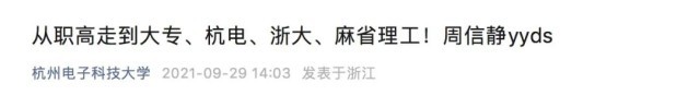 2023年,杭州电子科技大学在提到周信静时称,他是目前国内最有名的“求学逆袭王”。他的读书过程堪称励志典范:职高——大专——专升本——考研——读博。