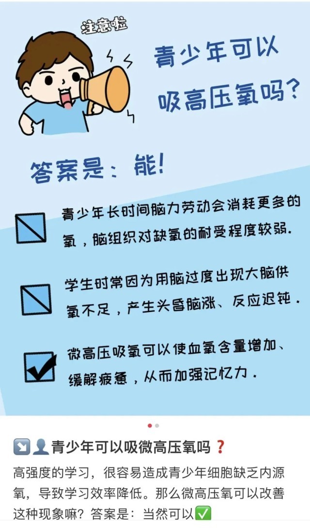 对于学生党这类青少年来说,在接受高压氧治疗前,必须经过专业医生的诊断、评估,确有需要的再进行治疗。目前医院常规治疗方案是两个大气压、吸氧60分钟、每天1次,在理论上不会出现肺型氧中毒。”