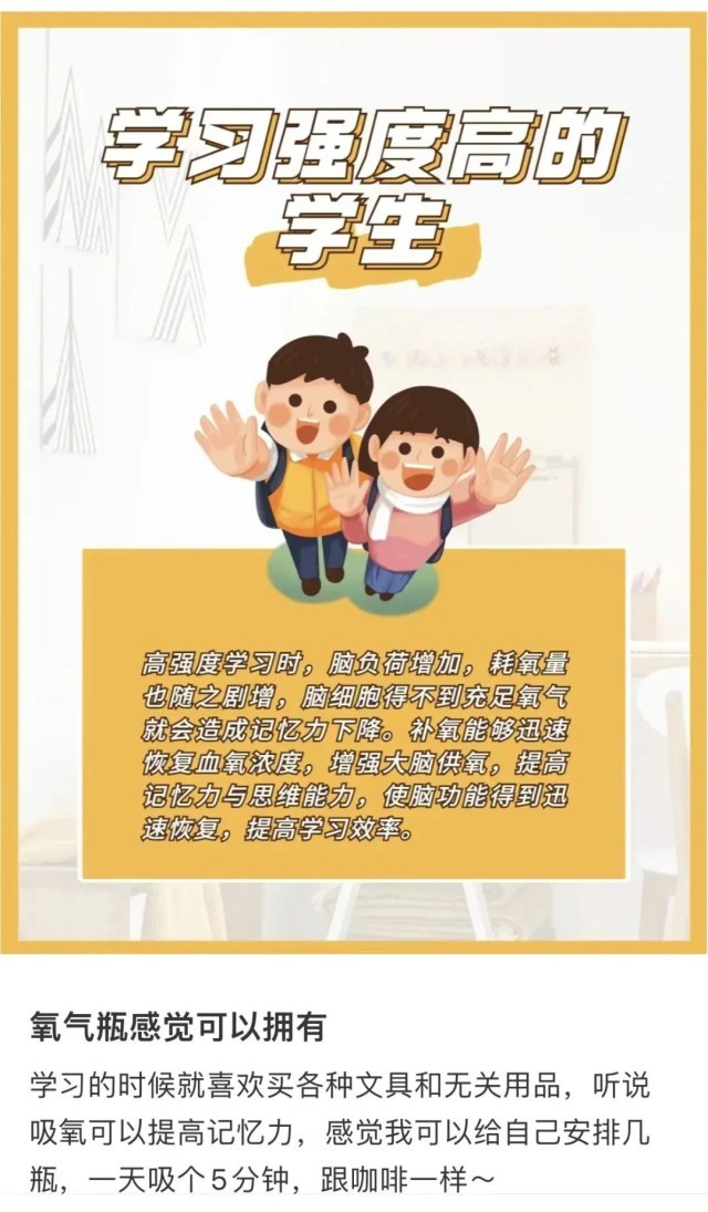 “听说吸氧有助学习,立马买了试试,吸了确实感觉精神了一点……”