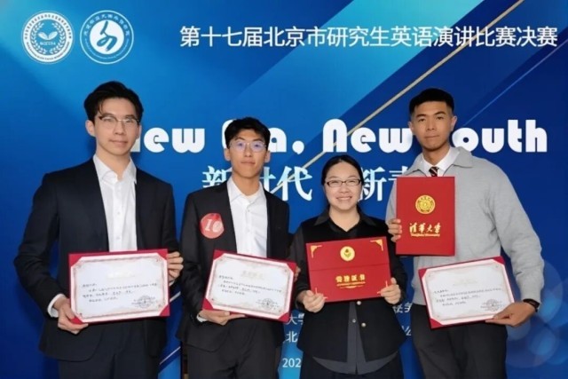 清华大学决赛选手与指导教师:黎彤(左一)杨韧通(左二)董焱宁(指导教师,右二)赵亚巍(右一)