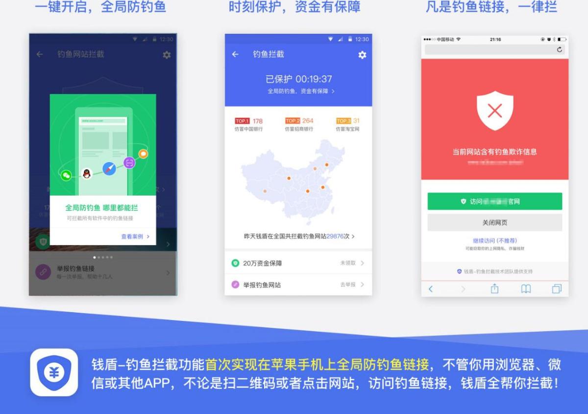 随着互联网的普及,电信网络诈骗形式日趋严峻,在美国和英国等已经成为了社会的第一大犯罪类型,在中国,它也以每年30%的速度在增长。钱盾作为国务院联席办推出的“互联网+”反诈平台,一直致力于用科技守护百姓资金安全!全局防钓鱼正是钱盾团队勇开先河,全面创新道路的一大研发成果!去苹果商店或各大安卓应用商店搜索“钱盾”,即可免费获得业界首个防钓鱼神器。