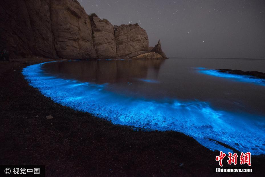 近日,大连小黑石附近海域再现“荧光海”奇观,泛着荧光的海浪不断涌向岸边,形成一条晶莹的蓝色光带,仿佛璀璨的银河落入人间。图片来源:视觉中国