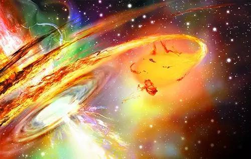 虽然撕裂一颗恒星这样的大规模事件已经够壮观了,但这还只是一场烟花表演的开始。在恒星被撕裂之后,碎片将分散开,逐渐偏离恒星的原始轨道。基础轨道力学指出,大约一半的碎片将被排出,成为从黑洞附近流出的纤长细丝,而另一半则旋绕黑洞,形成一个吸积盘 ——一种缓慢落入黑洞的螺旋环结构。当吸积盘的物质落入黑洞时,会加速至接近光速,并在引力和摩擦力的压缩和加热下,温度不断升高,在接近250 000℃时会开始发光。在几周或几个月的时间内,一次典型的潮汐瓦解事件将导致先前休眠和看不见的黑洞暂时比星系中的所有恒星都要亮。