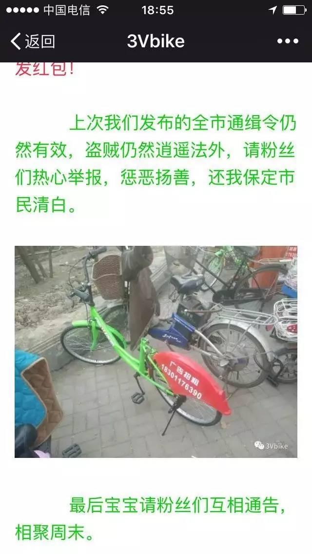 3Vbike单车运营的4个月间,单车丢失一直是困扰其发展的重要问题。为了解决这个问题,3Vbike多次在微信订阅号中提醒用户规范停车,同时,还采取了将车骑到指定地点奖励用户骑行券等措施。