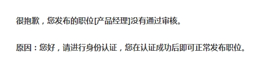 不过,就在今天凌晨系统突然提示发布的职位没有通过审核,原因是没有进行身份认证。