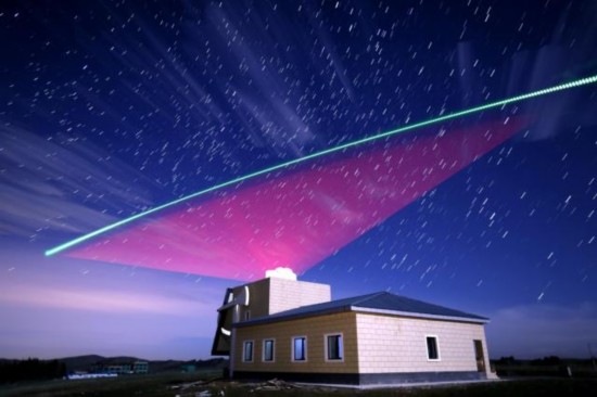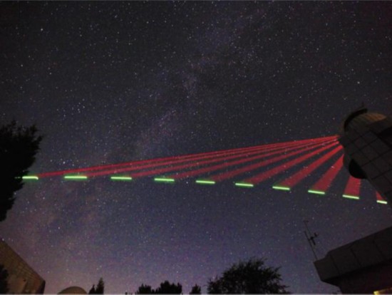 “墨子号”开展量子密钥分发,2017年5月摄于乌鲁木齐南山,多张照片合成了卫星过境全貌。(中科院供图)