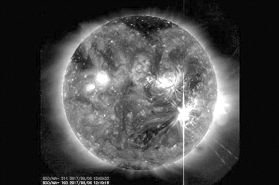北京时间6日,太阳爆发了两次太阳耀斑,到达峰值时间分别在下午5时10分和晚上8时02分,级别分别为X2.2和X9.3,后者是10年来的最强耀斑。美国国家航空航天局(NASA)捕捉到了这两次耀斑的图像。