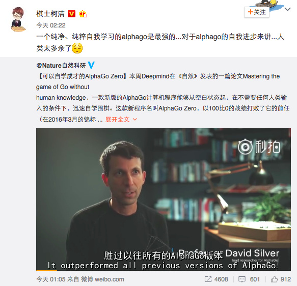 除了夜猫子们第一时间看到了这则消息外,曾与AlphaGo有过交战的柯洁也在第一时间做出回应,柯洁表示,“对于AlphaGo的自我进步来讲...人类太多余了”。