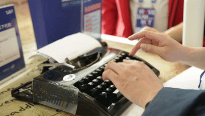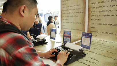 复古打字机展台边上真的是围满了人,三名程序员小哥哥正在用复古打字机疯狂写代码,手指跃动间留下的残影代表着他们目前打字速度不相上下,势必要在这场打字速度赛上获得第一名,看得众人瑟瑟发抖,这莫非就是传说中的“程序员一敲键盘,八匹马都难追!“