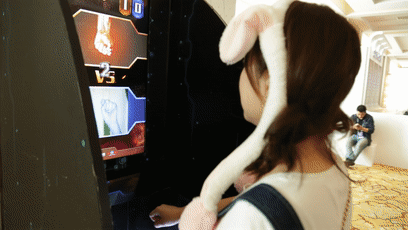 会场中央一台橙黄色的机器前突然排起了长队,这又是什么好玩的?走近一看,这不就是大名鼎鼎的猜拳大师嘛!听说它是猜拳界的“独孤求败。” 让我“西门吹雪”前去会会它。眼看着一个又一个小伙伴垂头丧气的败下阵来,让我心里忍不住有点慌张。果然,在三局惨烈的较量下,我最终以1:2败给了猜拳机,猜拳大师名不虚传!